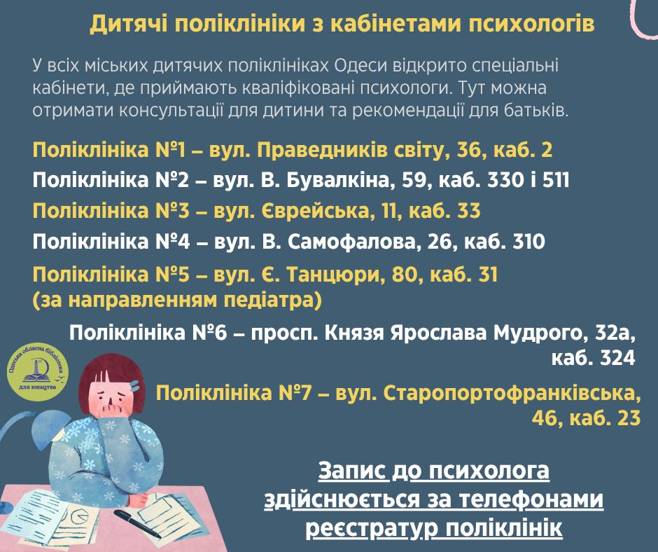 У всіх міських дитячих поліклініках Одеси відкрито спеціальні кабінети, де приймають кваліфіковані психологи. Тут можна отримати консультації для дитини та рекомендації для батьків.